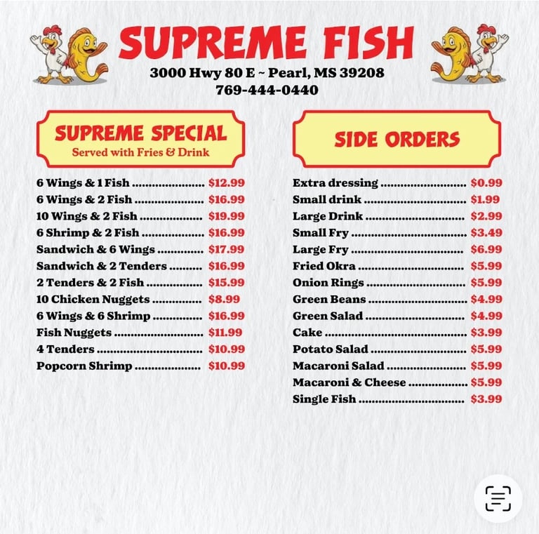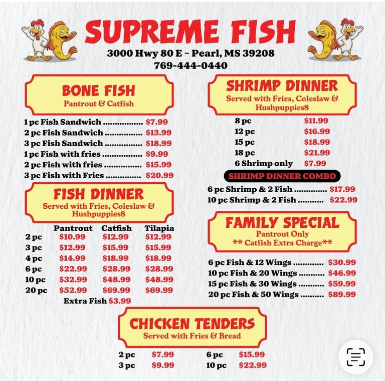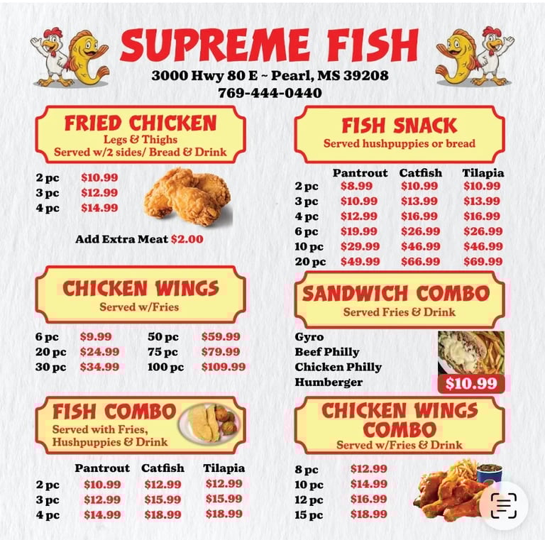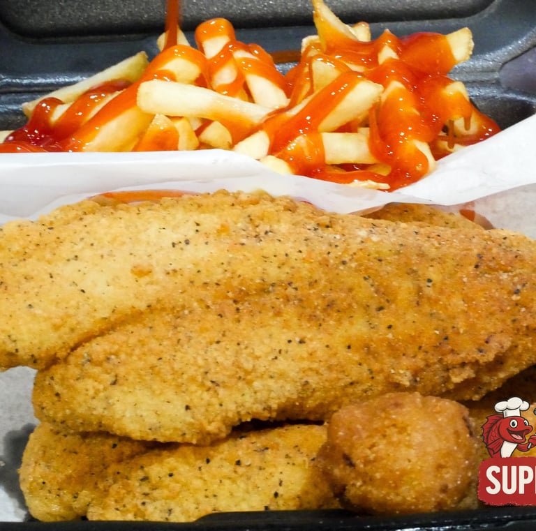 Crispy fried seafood, chicken, and juicy burgers.
